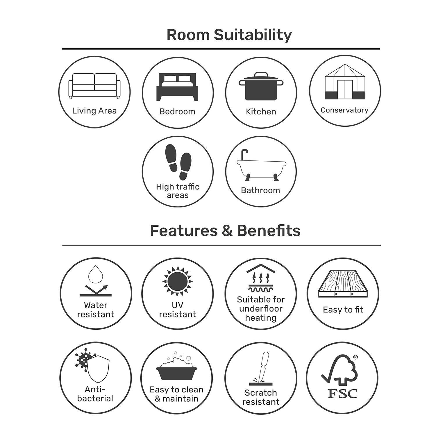 | Rooms Suitable For | Kitchen, bathroom, living areas, conservatory, high traffic areas |