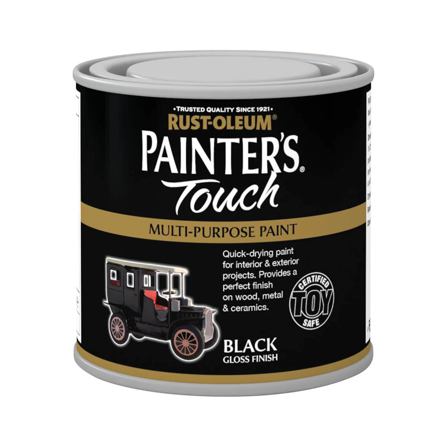 A multi-purpose, water-based paint for a wide range of small projects and crafts. Certified Toy-Safe, this paint can also be used to decorate children’s toys and furniture. Rust-Oleum Painters Touch brush paint is Toy Safe, subject to Toy Standard Testing: BS EN 71-3: 2013 + A1:2014, Migration of Certain Elements. Typical applications include children’s toys, picture frames, vases, bric-a-brac and garden accessories. Can be applied to wood, metal and ceramic. Application – Stir well before use. Use only when temperature is between 10-32oC and humidity is below 85% to ensure proper drying. Previously painted surfaces should be lightly abraded to provide a key. Bare metal and wood should be suitably primed prior to painting. Apply paint with a soft brush using light even strokes taking care to avoid unsightly runs. Coverage – Up to 6m2/litre per coat. Coverage may vary depending upon method and rate of application and porosity of surface. Drying Time – Dries to touch in 30 to 60 minutes. Allow at least 2 hours between coats.