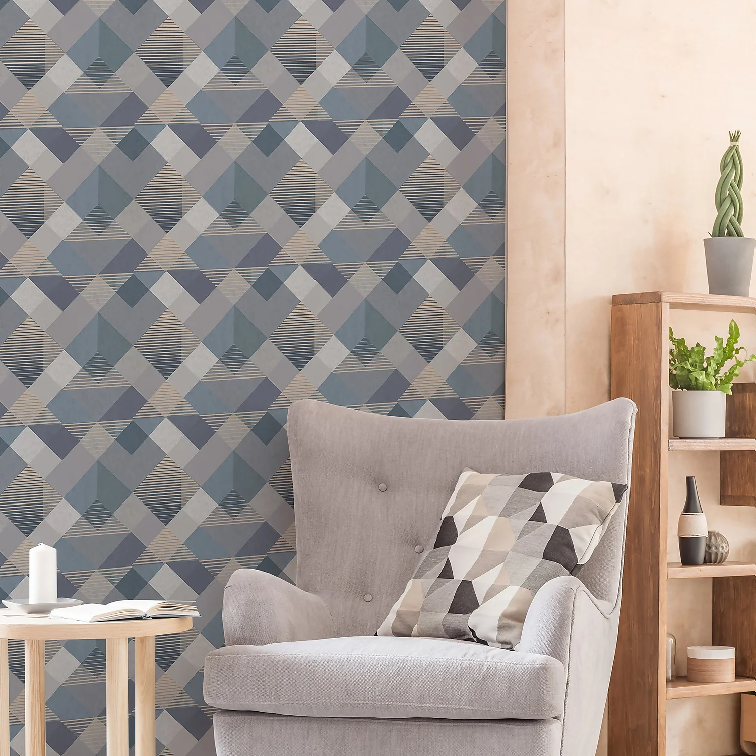 This modern geometric wallpaper with a classy teal design and bold colour palette will add depth to any home. Perfect for a feature wall as the design is a masterpiece in its own right.